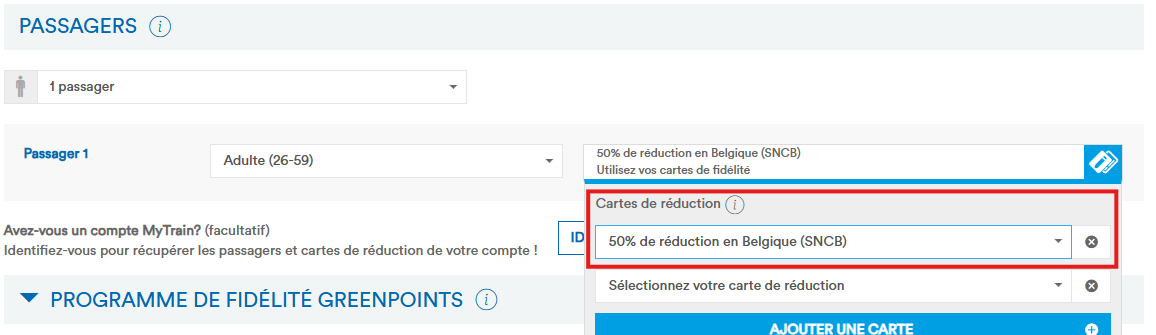 Lorsque vous utilisez un Coupon FIP SNCB, un billet transfrontalier peut être réservé via le site web, qui prend en compte le trajet gratuit sur le territoire belge. Pour cela, sélectionnez la réduction “Gratuité en Belgique (SNCB)” pour les voyageurs. Cela permet par exemple de réserver très facilement des trajets de la Belgique vers Lille (hors TGV, tarif global et non exploité par la SNCB).